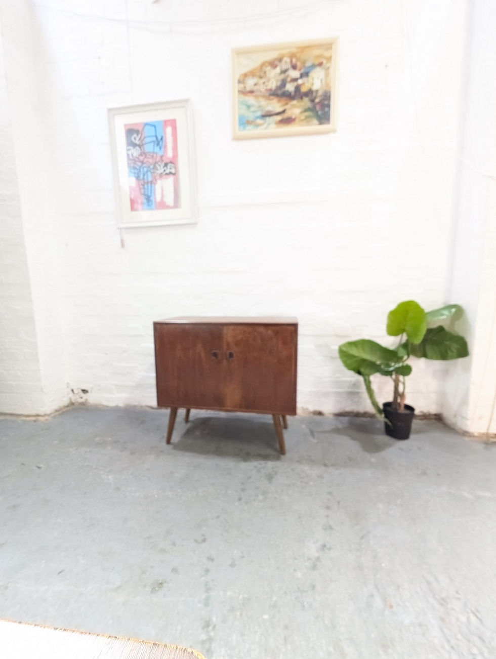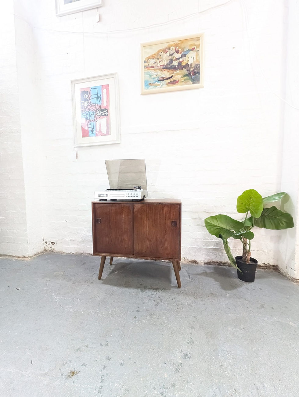 This Meredew mid-century teak coffee table features a convenient drawer and storage cabinet. This table is also ideal storing records. Equipped with casters, it offers effortless mobility. Please note the minor surface imperfections on the tabletop, as depicted in the accompanying images. Overall, the piece is in good condition.